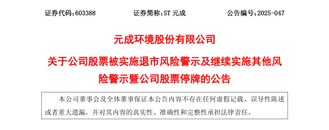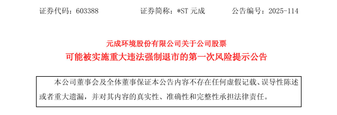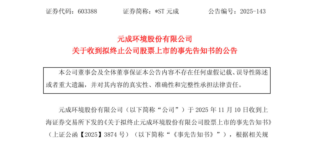 目前,公司已经收到上交所下发的《关于拟终止元成环境股份有限公司股票上市的事先告知书》(上证公函【2025】3874号),公司股票也于11月11日开市起停牌。