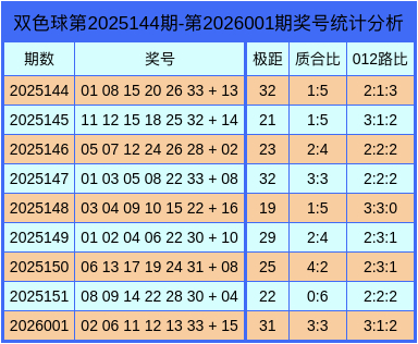 上期回顾:双色球第2026001期回顾:红球02、06、11、12、13、33 + 蓝球15。