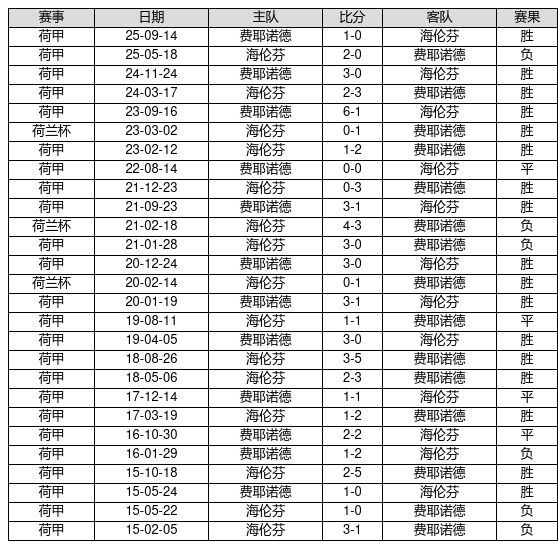 费耶诺德 VS 海伦芬两队近10年的交战次数为27场,费耶诺德17胜4平6负,赢球概率为63.0%,平局概率为14.8%,输球概率为22.2%。
