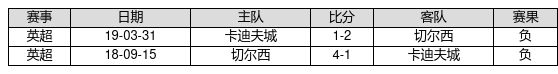 卡迪夫城 VS 切尔西两队近10年的交战次数为2场,卡迪夫城0胜0平2负,赢球概率为0.0%,平局概率为0.0%,输球概率为100.0%。