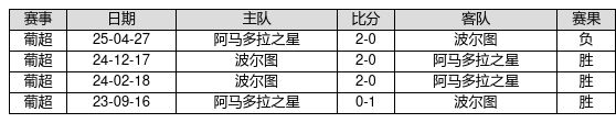 波尔图 VS 阿马多拉之星两队近10年的交战次数为4场,波尔图3胜0平1负,赢球概率为75.0%,平局概率为0.0%,输球概率为25.0%。