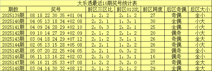 大乐透第2025148期奖号开出:03 04 14 30 32 +08 12。其中前区三区比为2:1:2,012路比为2:1:2,后区开出全大、全偶奖号。